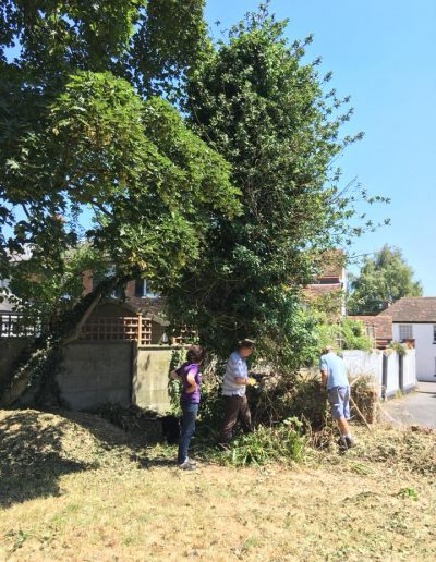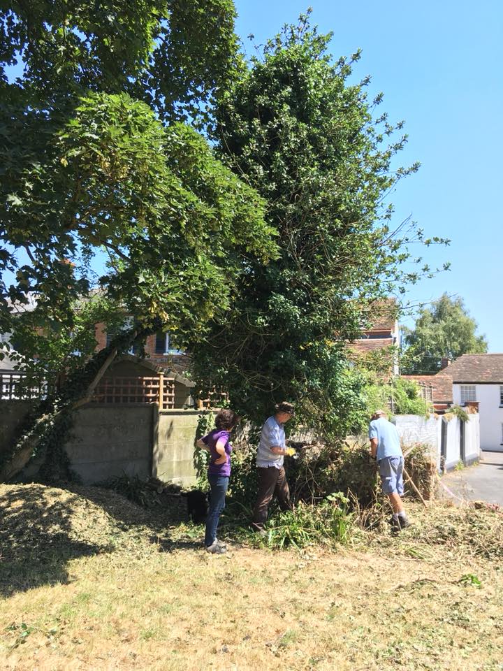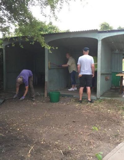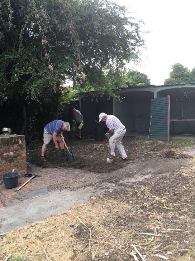 The remains of the old toilet block were uncovered when the vines and overgrown weeds were cut back. The brick work which is badly damaged was deemed a hazard and screened off with ‘ keep out’ tape. A group of volunteers are now dismantling the remaining bricks. We also finally discovered the Bat and Trap concrete trap fixing, and will be getting the pitch ready for next seasons league when Bat and Trap will return to the Chequers.